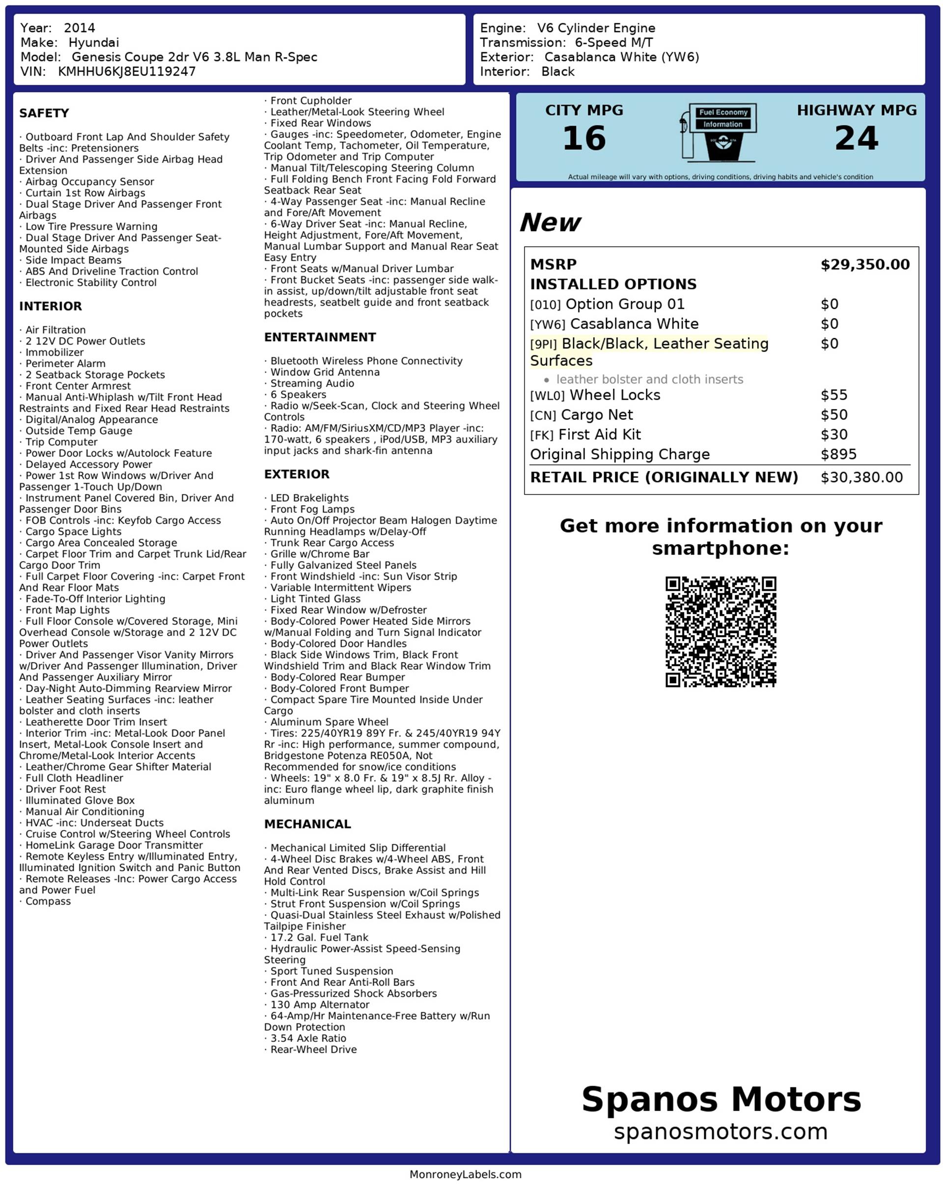 Finished in Casablanca White over a Black interior with leather bolsters and cloth inserts, this 2014 Hyundai Genesis Coupe 3.8 R-Spec delivers a pure, driver-focused experience with an aggressive edge.