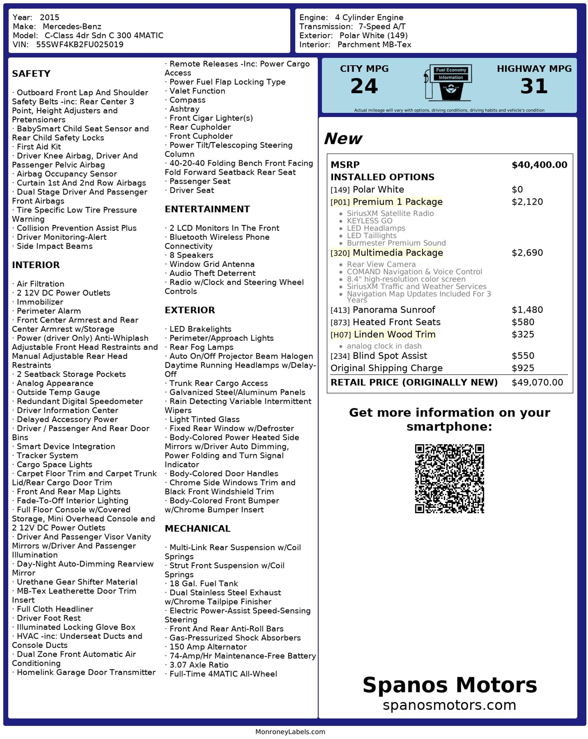 The 2015 C 300 4MATIC Sedan delivers a refined combination of performance, comfort, and modern technology, wrapped in a design that is both elegant and athletic. Finished in Polar White, this C-Class presents a clean, sophisticated look complemented by balanced proportions and a confident stance.