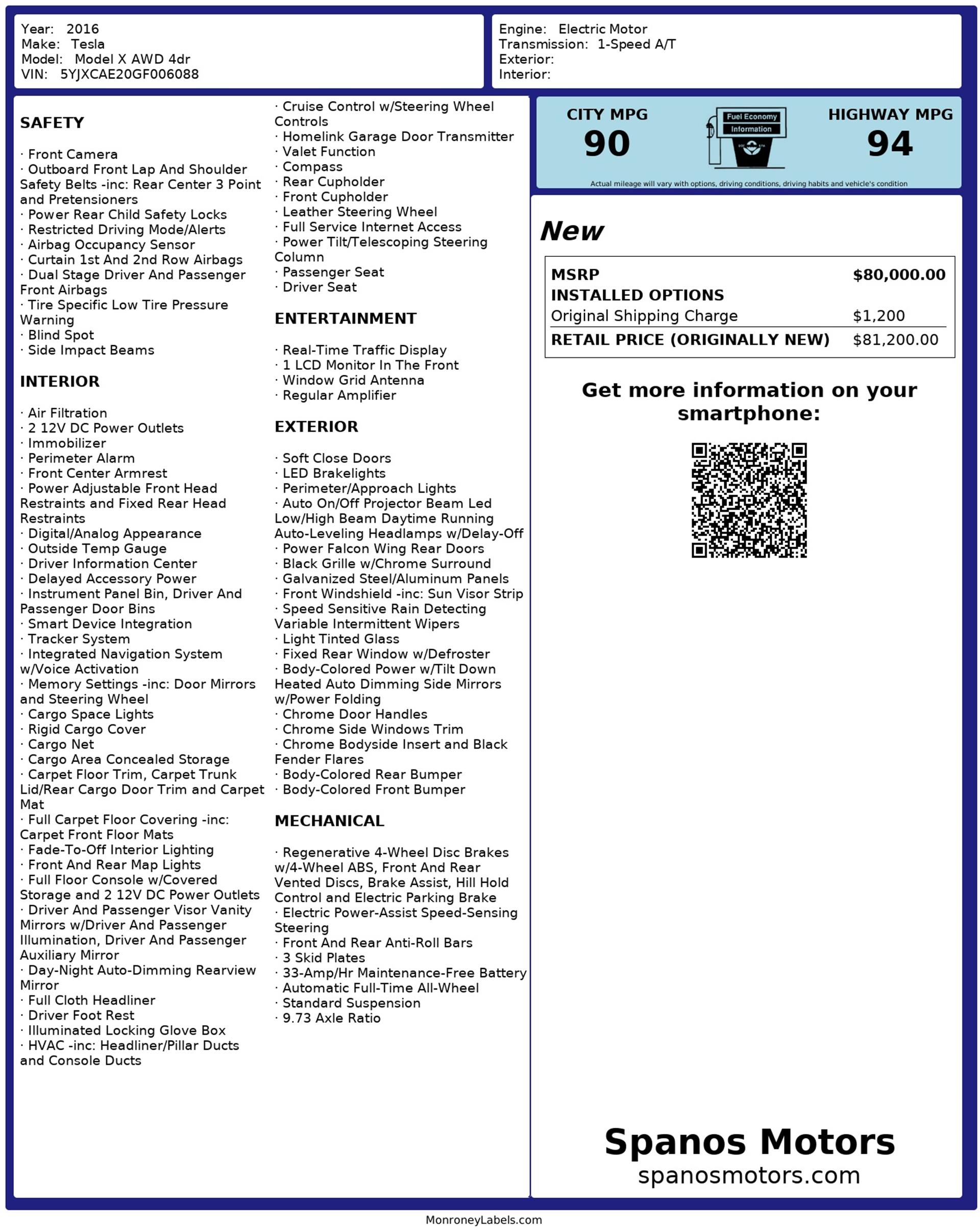 The 2016 Tesla Model X AWD redefined what an SUV could be—futuristic, powerful, and entirely electric. With its bold stance and signature falcon wing doors, it immediately commands attention, blending utility with innovation in a way only Tesla can.