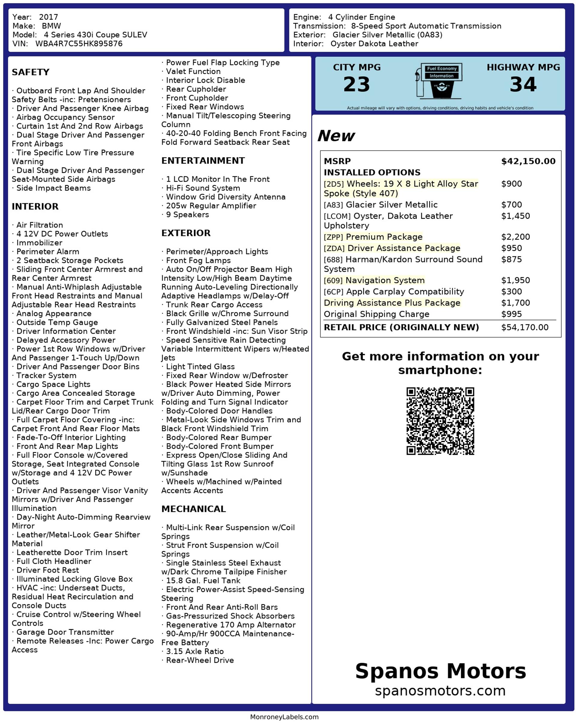 This 2017 BMW 4 Series 430i Coupe SULEV delivers a clean, athletic driving experience wrapped in classic BMW coupe elegance. Finished in Glacier Silver Metallic, the exterior has a sharp, modern look that’s further enhanced by the 19-inch Star Spoke alloy wheels, giving the car a confident, planted stance without being overstyled.