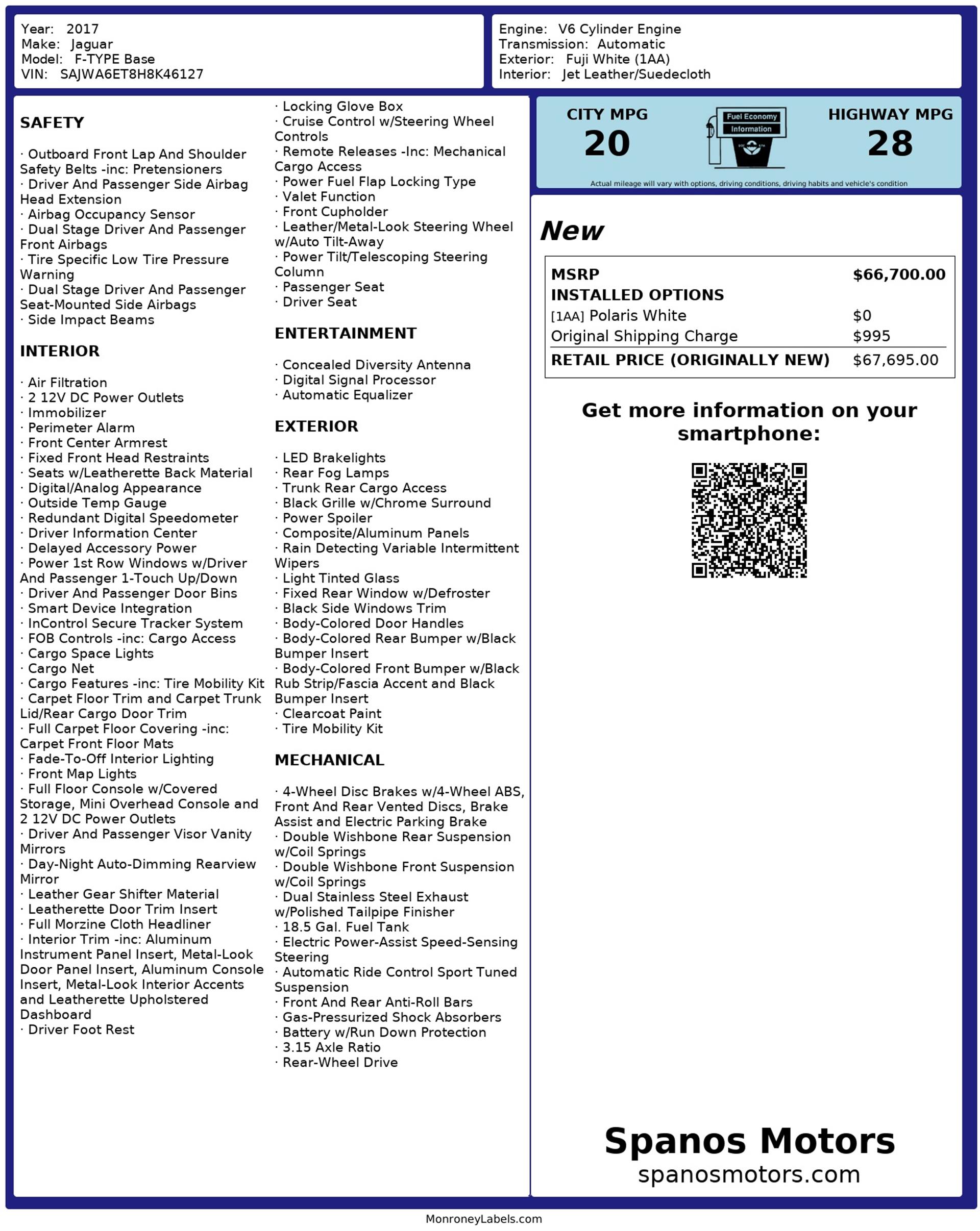 The 2017 Jaguar F-TYPE captures the essence of pure sports car design — sleek, aggressive, and undeniably British. Every line serves a purpose, sculpted for performance and presence. Beneath the long aluminum hood lies a responsive 3.0-liter supercharged V6, delivering the signature Jaguar growl and thrilling acceleration that define the F-TYPE experience.