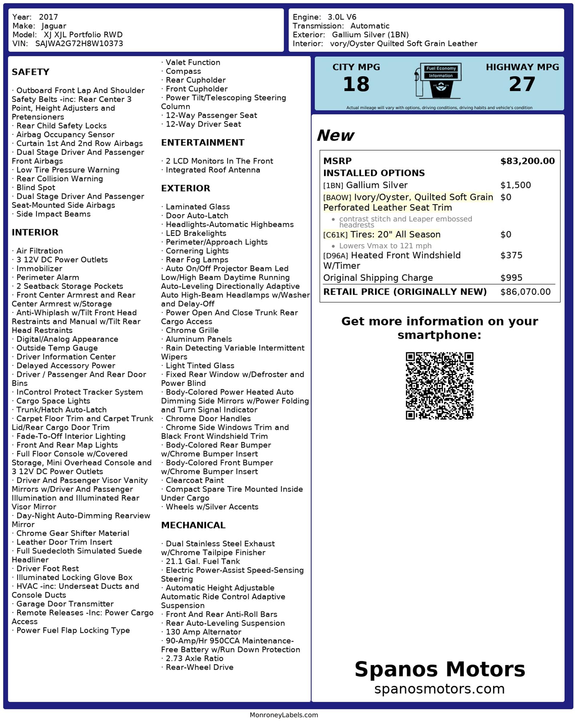 The 2017 Jaguar XJ XJL Portfolio RWD is a flagship luxury sedan that combines elegance, performance, and cutting-edge craftsmanship. Its elongated body delivers an unmistakable road presence, finished here in Gallium Silver for a sleek, refined look.
