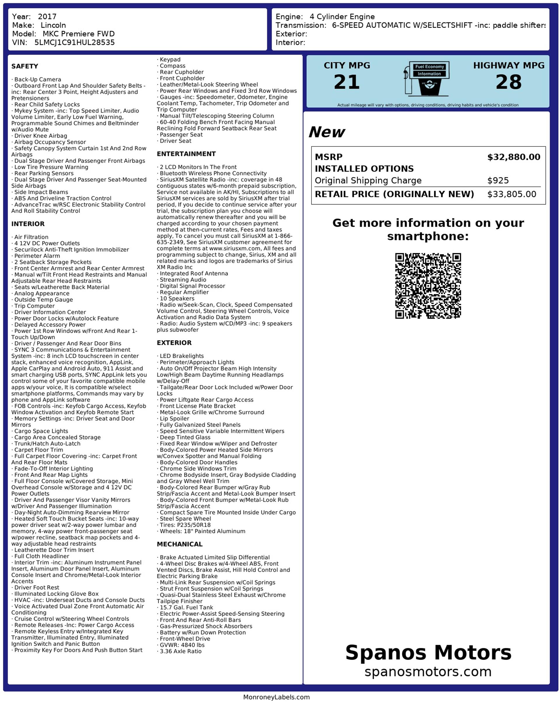 Technology and convenience features include push-button start, dual-zone automatic climate control, Lincoln’s SYNC infotainment system, Bluetooth connectivity, and a power liftgate, providing easy access to entertainment, navigation, and vehicle controls.
