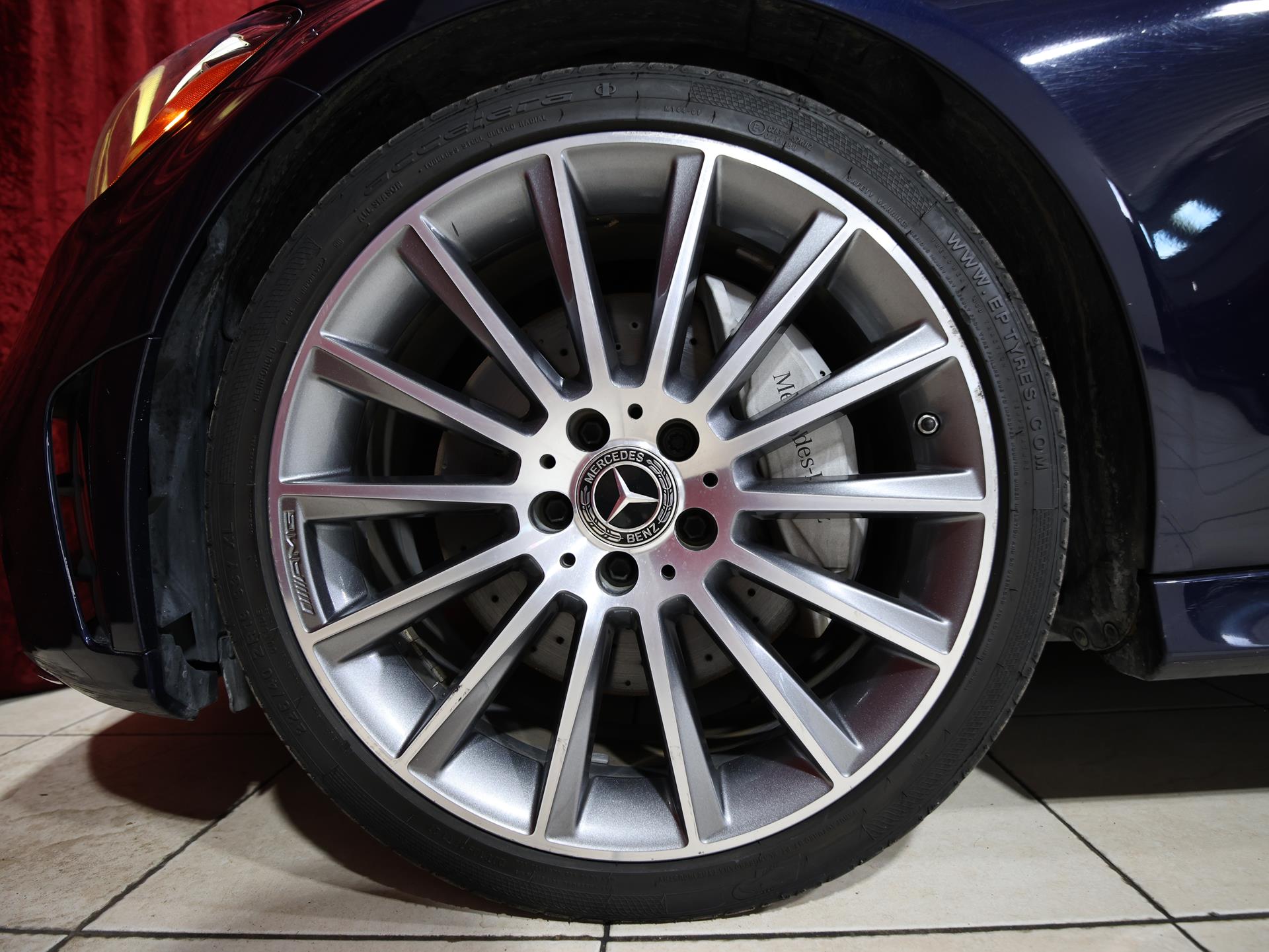 Equipped with the AMG Line Package, it features a sport suspension, AMG exterior styling, diamond grille, AMG interior accents, and a multifunction sport leather steering wheel. Riding on 19 AMG multispoke wheels with high-performance run-flat tires, it combines style and handling confidence.