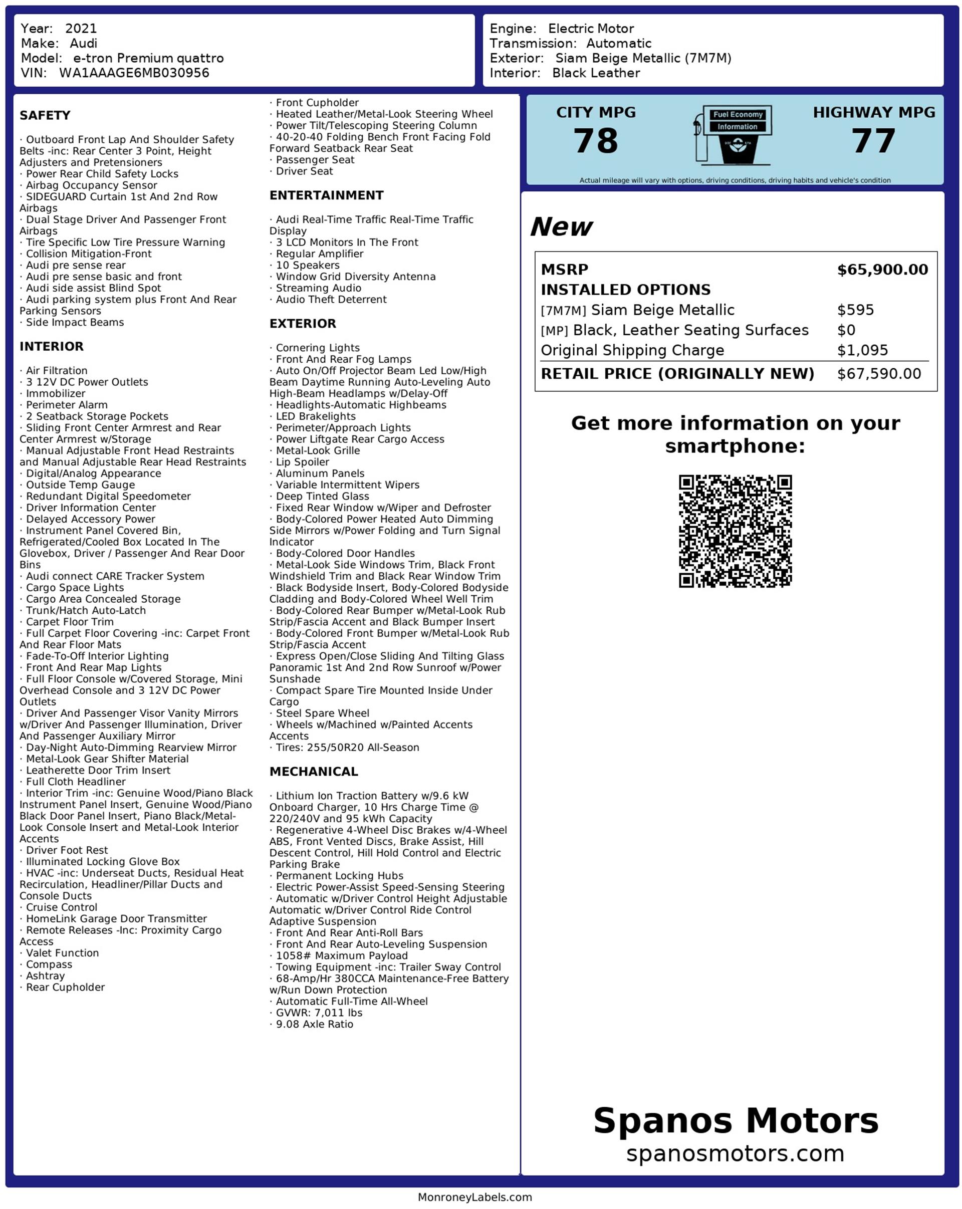 The 2021 Audi e-tron Premium quattro blends quiet electric power with classic Audi refinement. Finished in elegant Siam Beige Metallic, it stands out with a warm, upscale presence that feels both modern and timeless. The smooth, sculpted lines pair perfectly with Audi’s signature LED lighting, giving the e-tron a confident and sophisticated stance on the road.