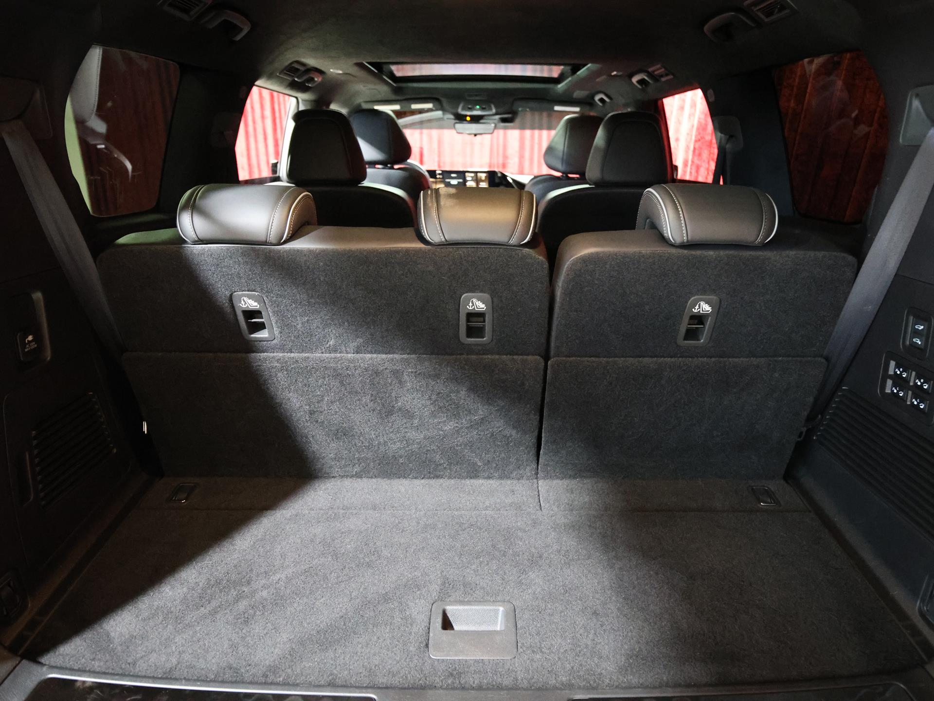 The Premium Cargo Package adds versatility for travel and daily use, including a reversible cargo mat, smart luggage shelf, cargo blocks, console net, and even a soft-sided cooler—making the QX80 as functional as it is refined. An umbrella holder discreetly mounted beneath the driver’s seat is another thoughtful addition, underscoring the attention to real-world convenience.